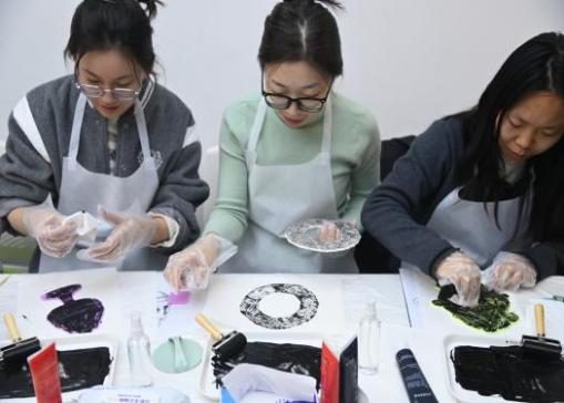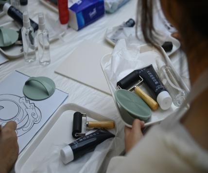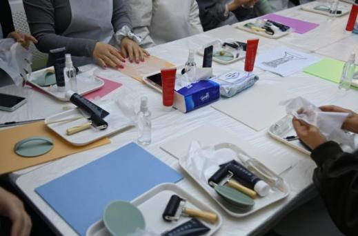雕刻完毕,最具仪式感的拓印环节拉开帷幕。同学们按照指导,将浓郁的黑色版画油墨挤在调色板上,用滚筒缓缓推开,仔细聆听油墨与滚筒接触的“滋滋”声,直至油墨分布均匀。随后,同学们小心翼翼地将油墨滚涂在雕刻好的模板上,反复检查确保每一个凸起细节都均匀着色,尽显严谨认真的态度。