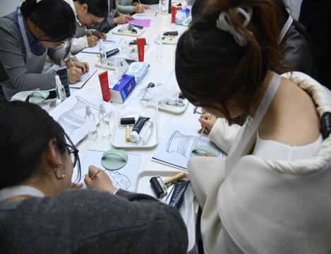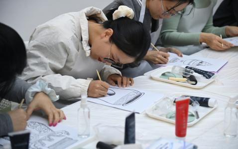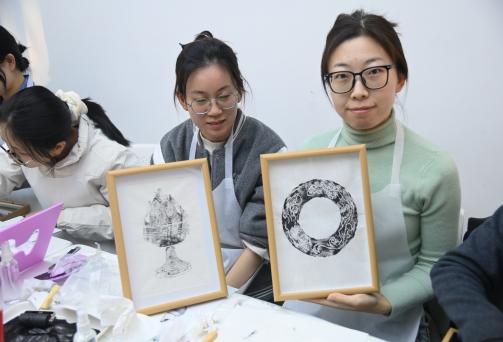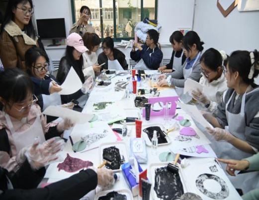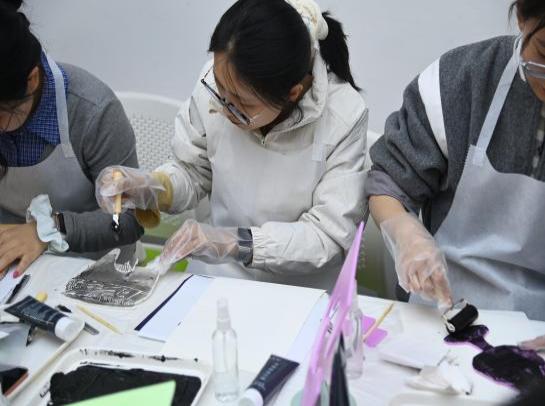 在领取吹塑板、小刀等工具后,现场瞬间安静下来,只剩下笔尖与刀锋在吹塑板上划过的沙沙声。同学们都化身为文化匠人,沿着图案的线条,细心雕刻拓印纹样。过程中,同学们耐心打磨每一处细节,不仅锻炼了动手能力,更在专注创作中沉淀心性,深刻体会传统手工艺所蕴含的“匠心”精神。