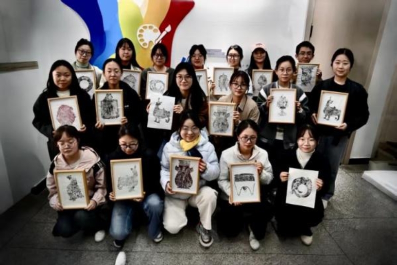 取一张干净白纸轻轻覆于模板之上,同学们手持马莲,均匀施压、缓慢摩挲。过程中,大家屏息凝神,生怕错过图案显现的瞬间。当缓缓揭开纸角,清晰的纹样完整跃然纸上时,大家发出由衷惊叹,现场满是欢笑,这一刻,大家切实感受到拓印艺术的独特魅力与创作的成就感。